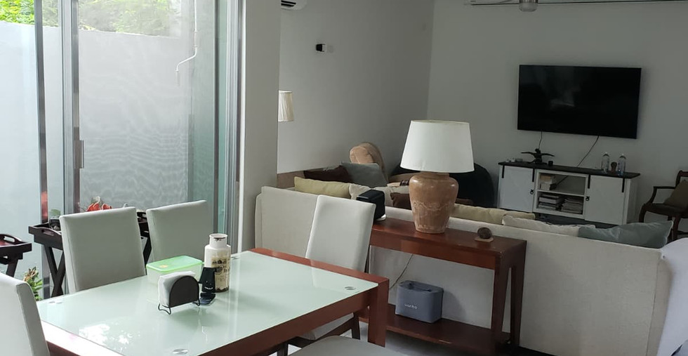 This comfortable home, which is sold fully furnished, offers a spacious living room, dining room, and kitchen with beautiful views of the jungle.